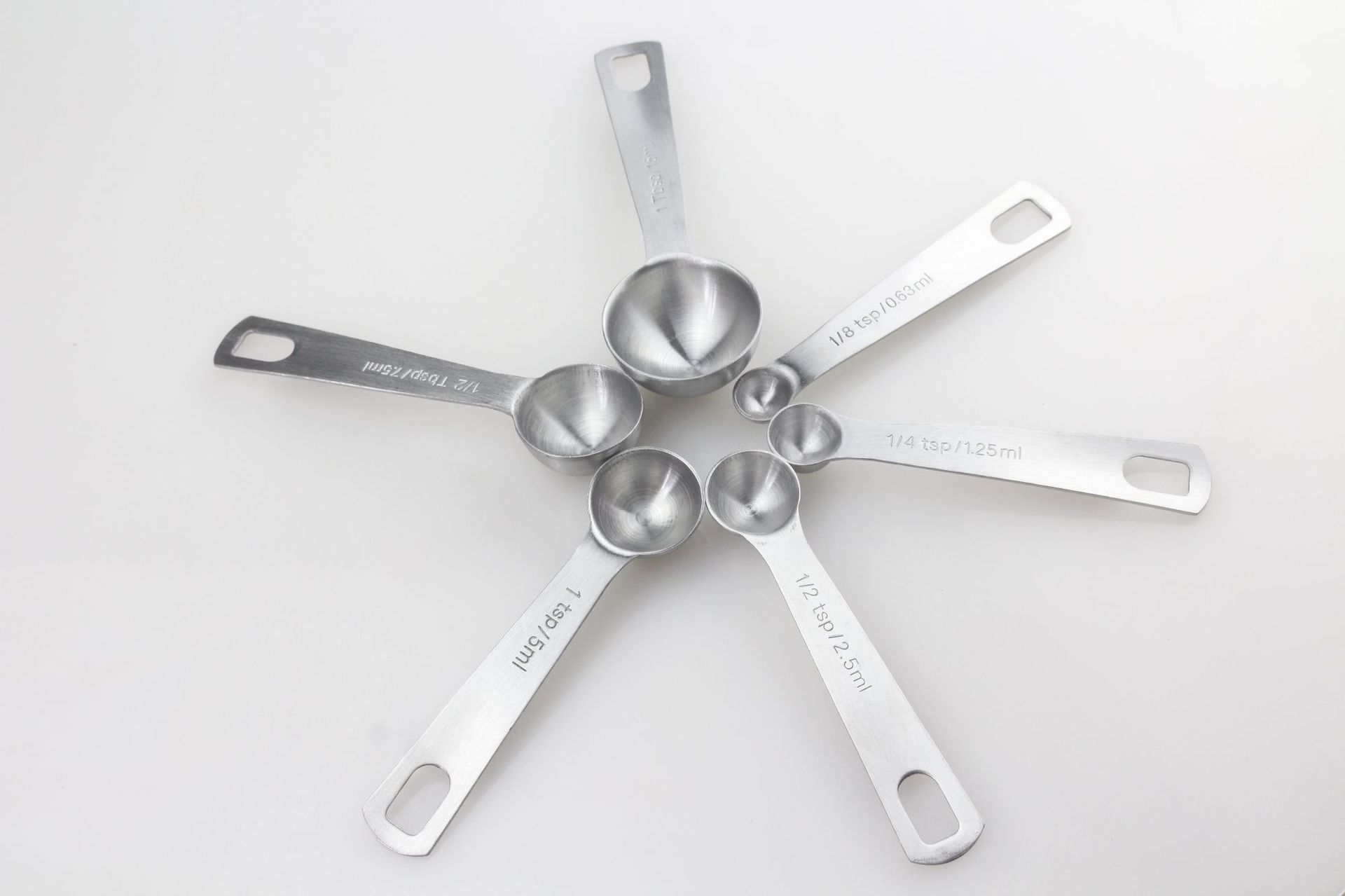 4.THOUGHTFUL DESIGN - Innovative cupped and rounded spoon heads allows reaching into spice jars and other small containers without spilling out. Set Contains 6 spoons: 1/8-tsp, 1/4-tsp, 1/2-tsp, 1-tsp, 1/2-Tbsp. and 1-Tbsp and conveniently connected by a unique D-shape ring which helps to keep the spoons together after a full day of baking or cooking. With each measurement is engraved on the handle of each spoon, there's no guesswork when adding spices to your dishes.