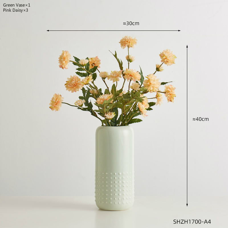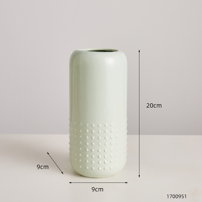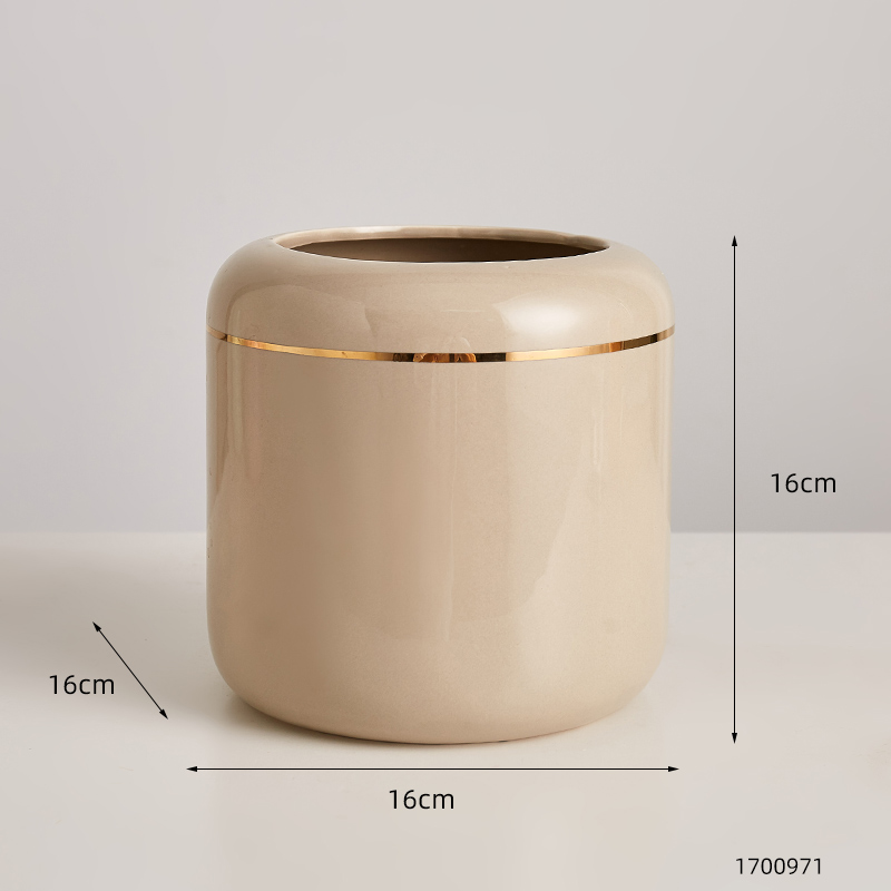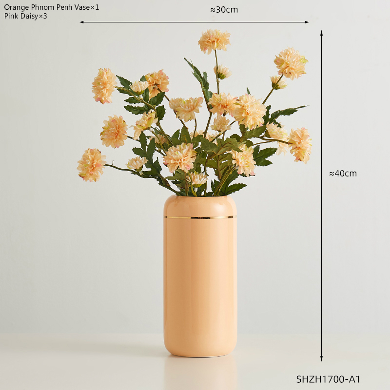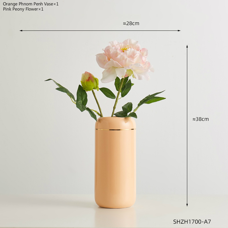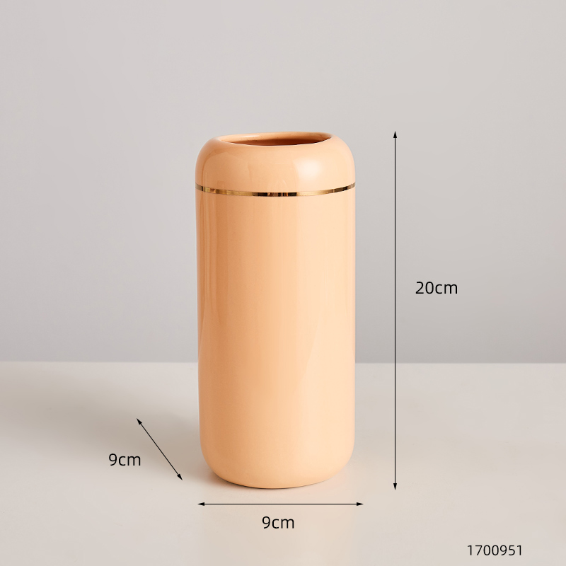 Expertly crafted, this glazed ceramic vase features a straight cylinder shape with a striking metal trim accent. Available in stylish shades of orange, pink, light green, and putty, it comes in two versatile styles. Add a touch of elegance and sophistication to any room with this functional and beautiful piece.