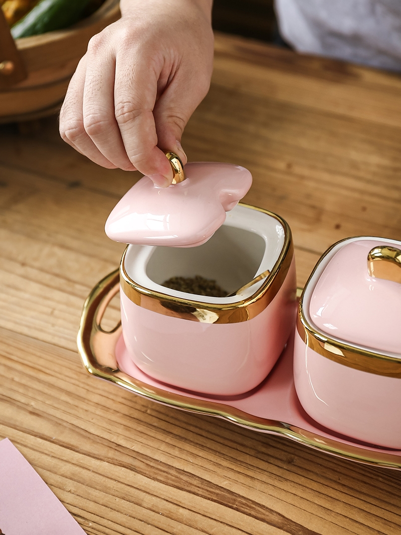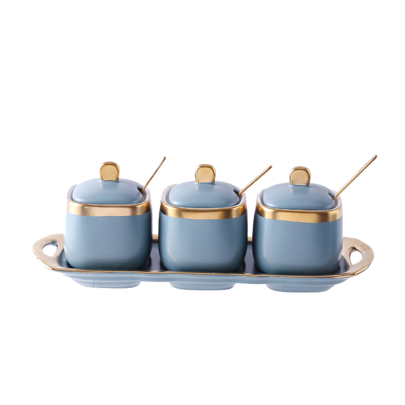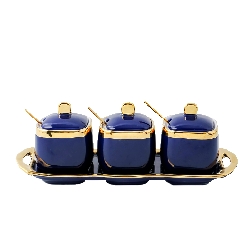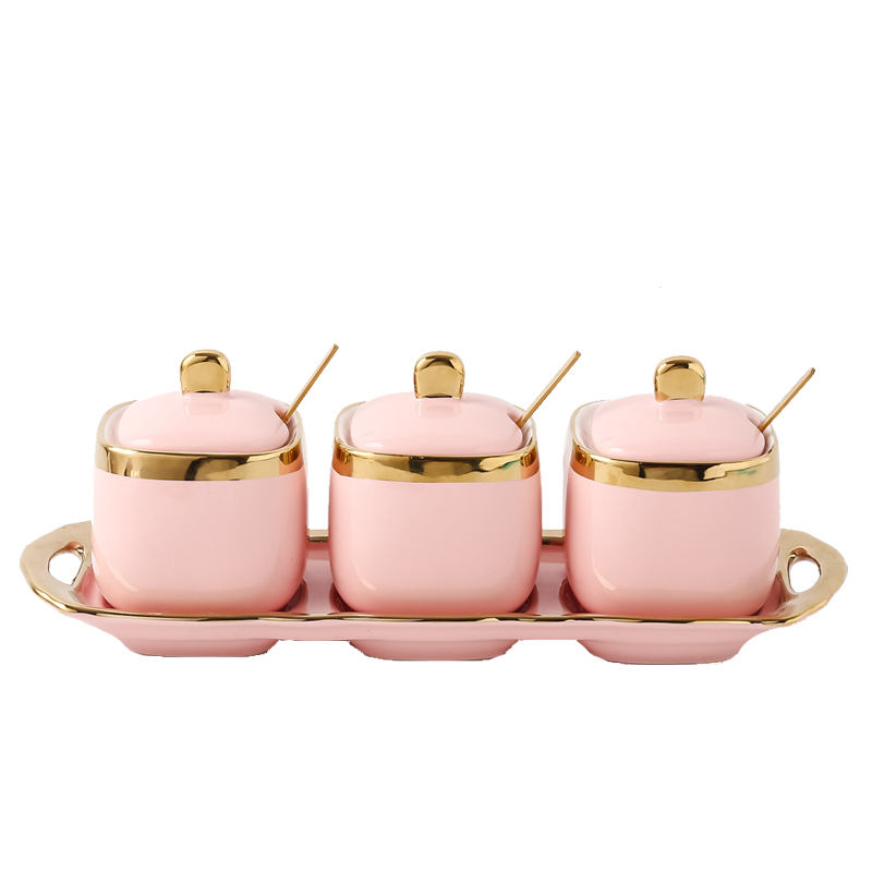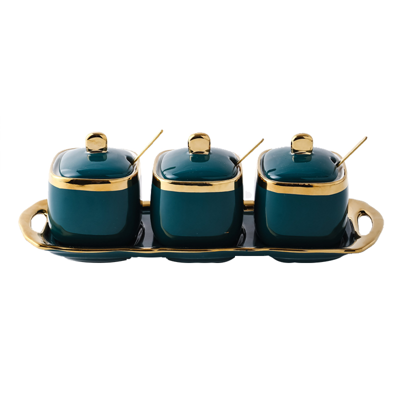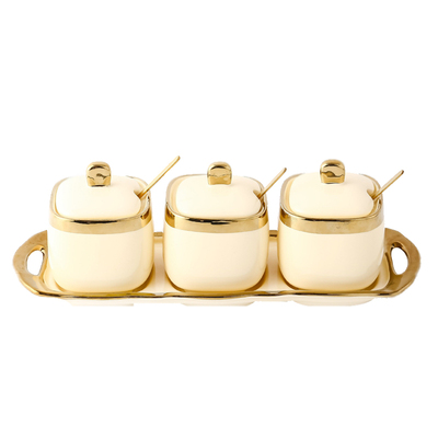 Beautiful glazed ceramic with gold trim condiment/seasoning dispenser set. Perfect for home, hotel, or restaurant. Three Jars on a tray with spoons available in various colors .