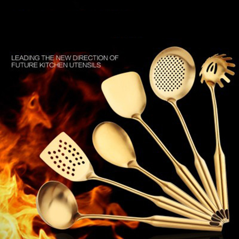 Upgrade your cooking game with our Golden Kitchen Utensil Set. This elegant set includes spatulas, spoons, a strainer, and spaghetti server. Crafted with beautiful golden accents, these utensils not only add style to your kitchen but also provide the essential tools for effortless cooking.