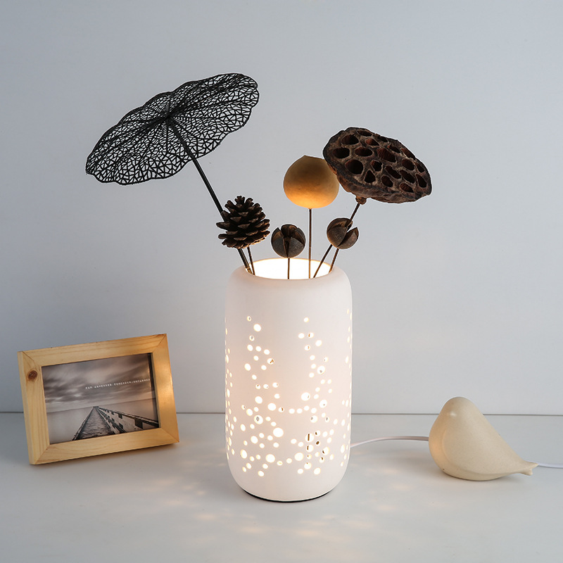 Illuminate your space with this stunning table lamp. The filigree design on the vase not only adds a touch of elegance, but also creates a unique dappled light pattern. Enjoy the natural style of dried botanicals displayed on top of the vase.