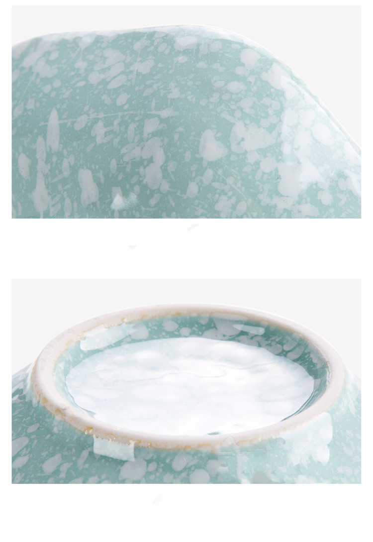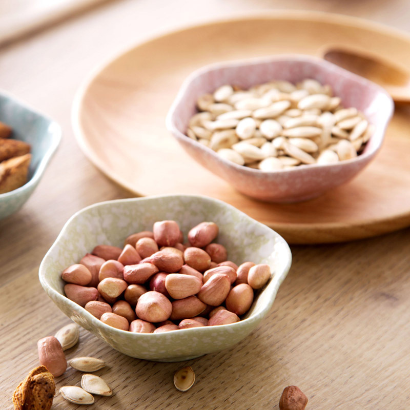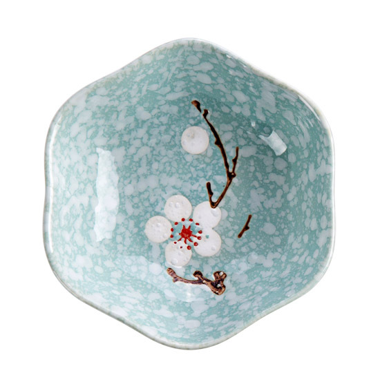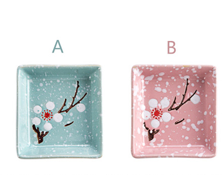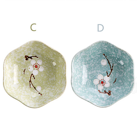Small decorative serving dishes for small candies, buts, macarons, treats, or condiments, relishes, toppings, dips, and sauces. Beautiful Japanese cherry blossom design with white snow on blue, green, or pink pastel backgrounds. Glazed ceramic.