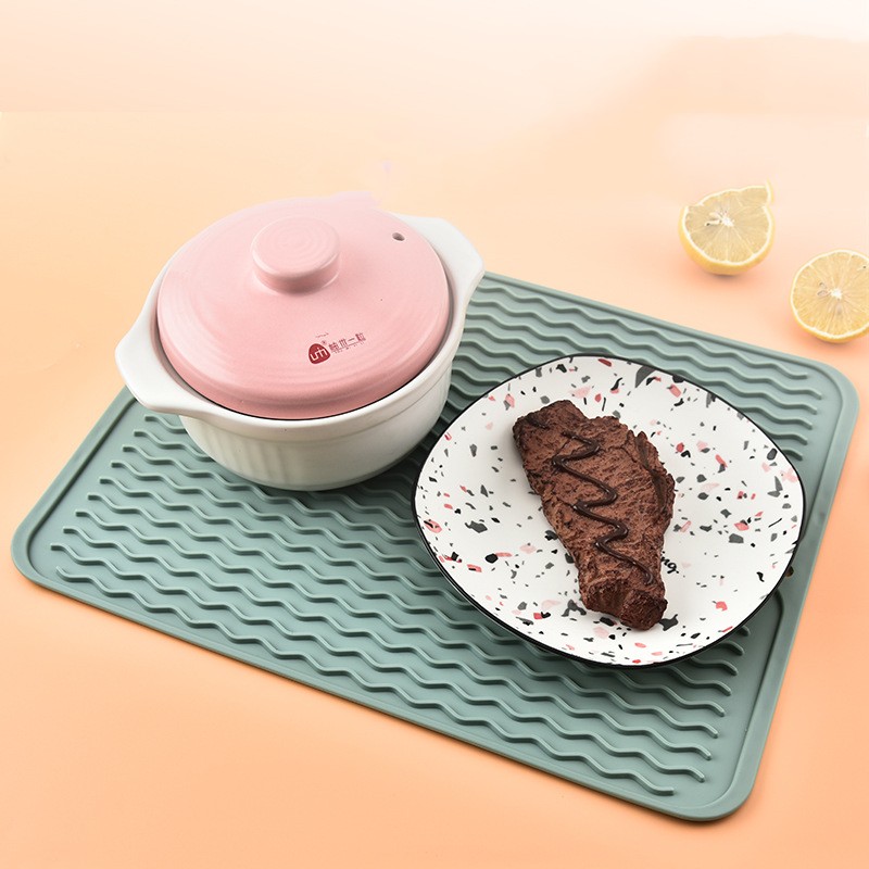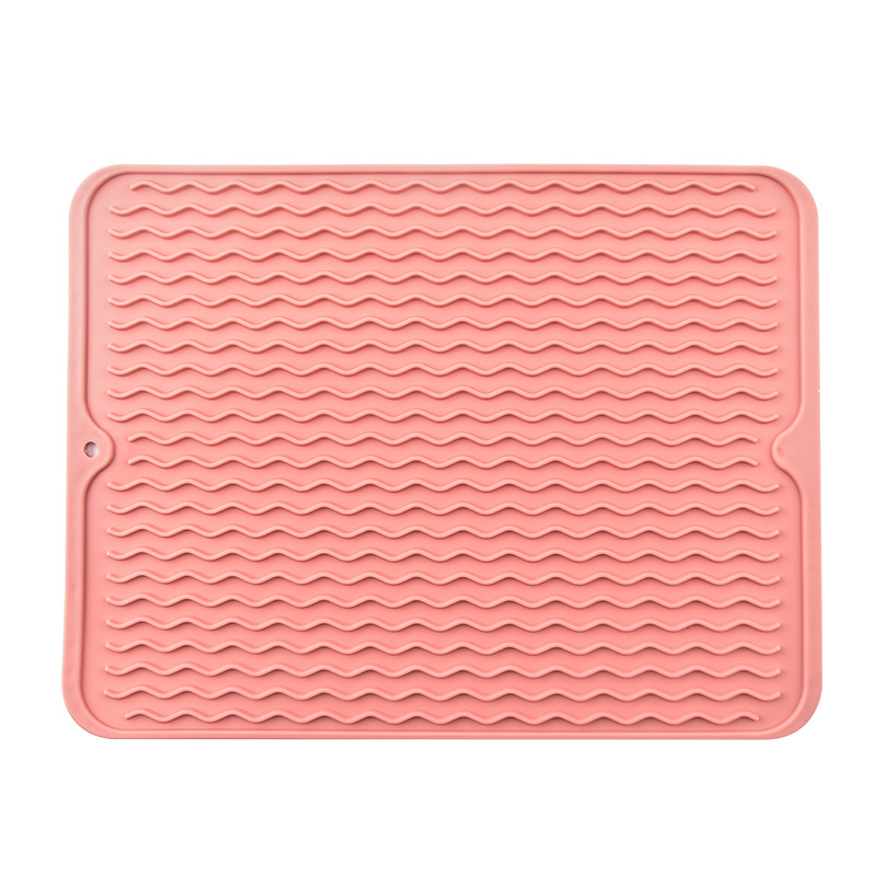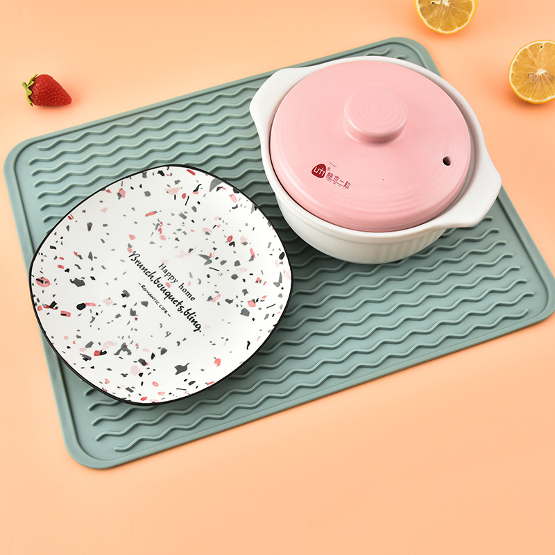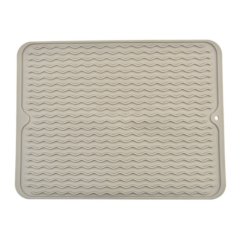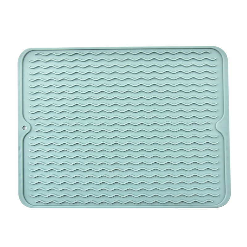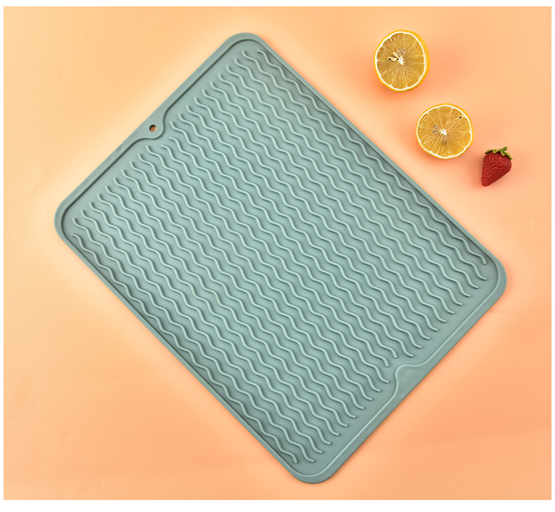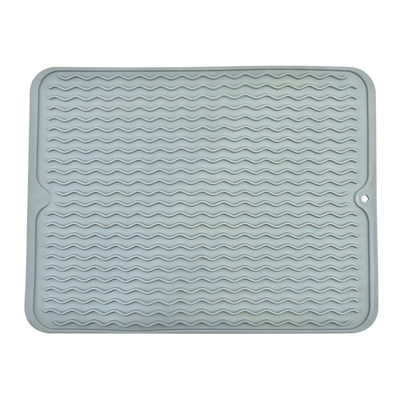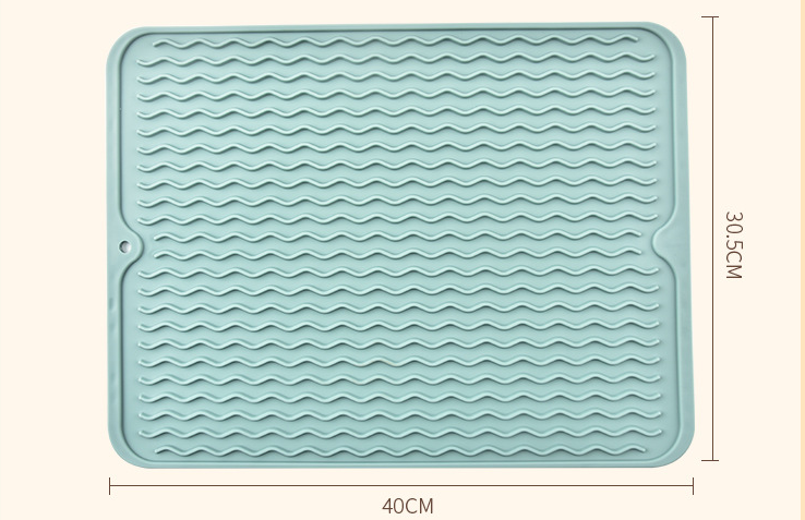This rubber drain mat has raised ridges that mimic waves in the sea to allow water to drip into the mat. A bordered edge prevents water limits water to the mat to keep surfaces dry. It comes in a variety of attractive colors to match any kitchen decor.