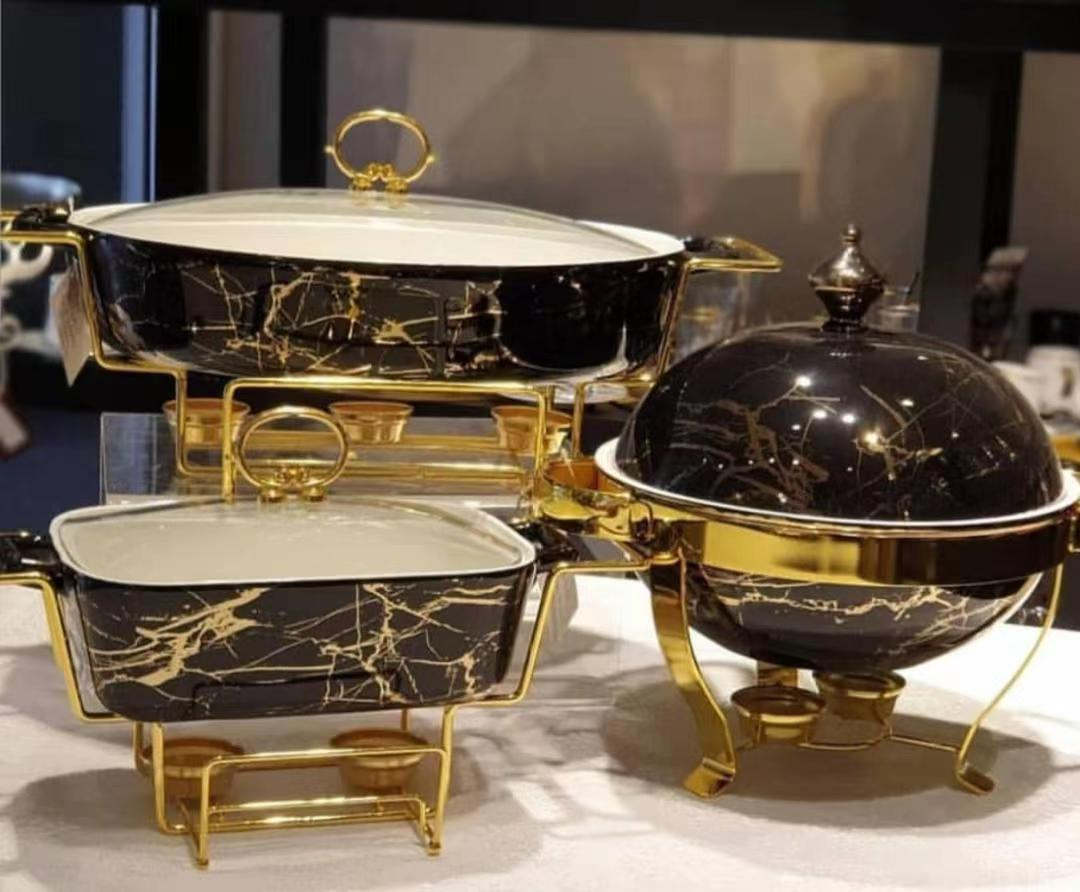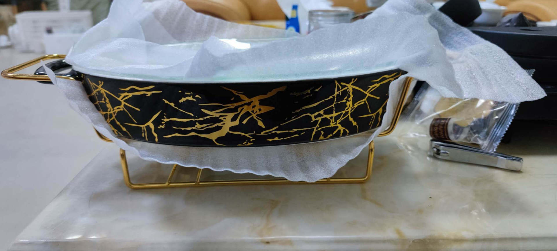 Rectangular Double-ear Ceramic Pot, Baking Pan, Tableware, Light Heat. Serve your fresh baked dinner in style with this elegant marbled porcelain baking dish with lid and gold stand. White with gold marbling adds refined elegance. Great for holidays, special occasions or daily dinners to show your family how special they are. Comes with glass lid and golden metal rack with cups to hold sterno or candles for keeping food warm.