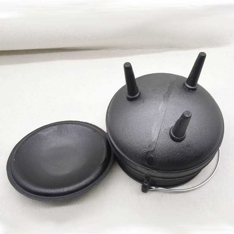 Small Black Cast Iron Cauldron - Real quality cookware for hearth, stove, or oven - and it is also a witches' pot that you can use for Halloween! Cauldron is black, has a metal handle and stands on 3 legs.