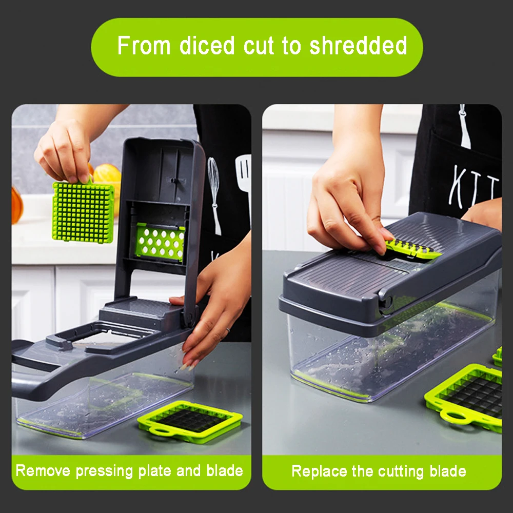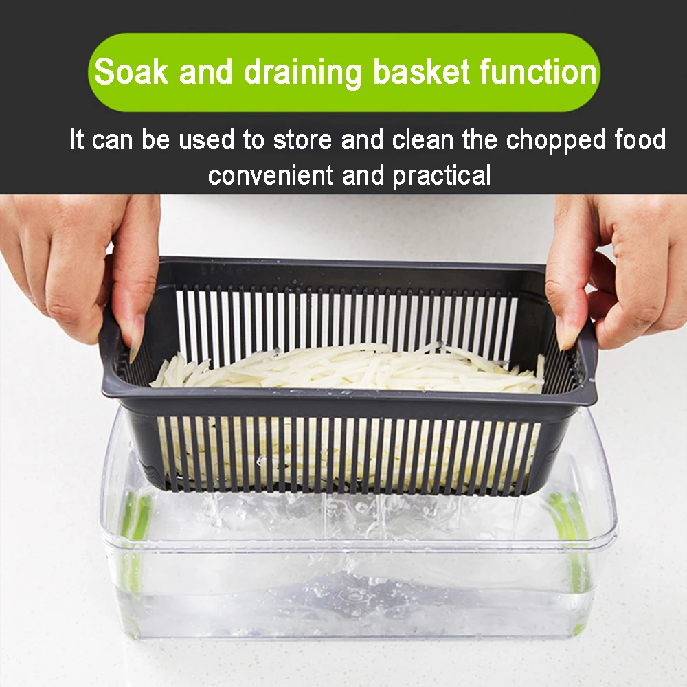 Upgraded onion and potato chopper:A large capacity container at the bottom with a water filtering basket, this allows you to clean vegetables and fruits directly after cutting and slicing, then drain excess water.