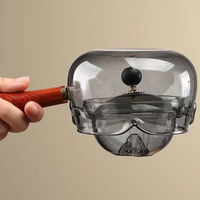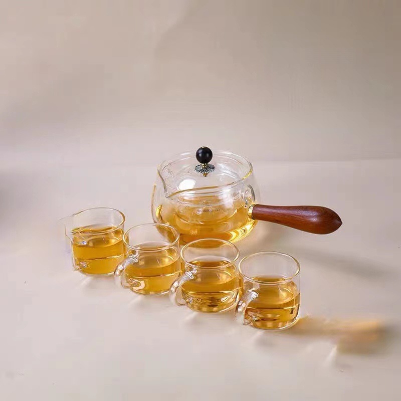 The Rotating Glass Tea Brewer Set features a chic and modern design, with your choice of a dark smoky colored glass or clear glass tea kettle. The set includes 6 cups for sharing and a wooden handle for comfort while pouring. Made with borosilicate glass, known for its heat resistant properties. Elevate your tea drinking experience with this versatile and stylish set.
