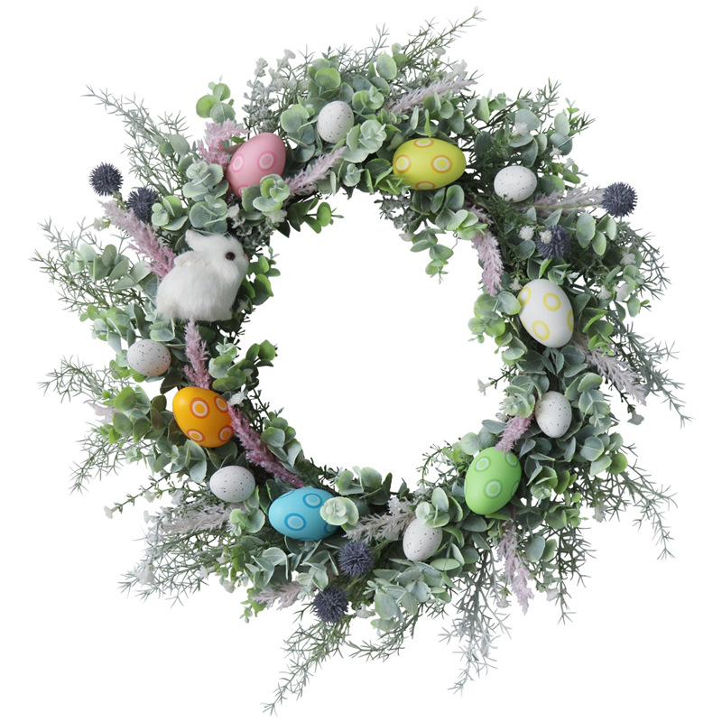 This festive Easter wreath features a combination of greenery, colorful eggs, and a charming bunny. With its vibrant pink, yellow, green, blue, and orange eggs, it adds a pop of color and charm to your front door. Elevate your home's decor and welcome the spring season with this delightful door hanging.