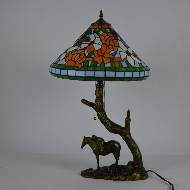 Expertly crafted with a vintage horse base, our Tiffany Table Lamps come in a variety of stylish lamp shade options. Add a touch of elegance to any room with these high-quality lamps. The horse base with a tree trunk stem adds a rustic and natural feel to a stained glass shade replicating authentic Tiffany stained glass designs.