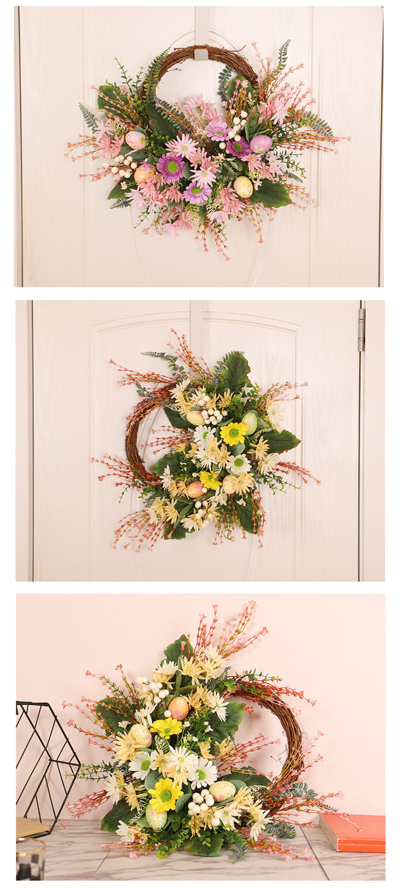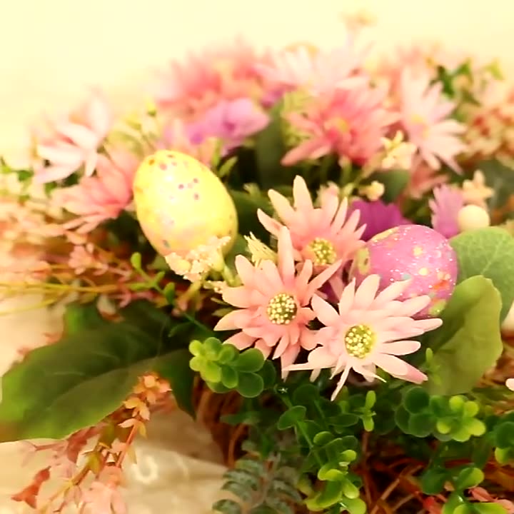 This elegant Wild Chrysanthemum Wreath features intricate blooms and festive Easter eggs, bringing a touch of natural beauty to any space. Handcrafted with care, featuring silk flowers, this wreath is perfect for Easter celebrations or as a versatile year-round decoration. Made with wild chrysanthemum flowers, it adds a charming touch to any home.